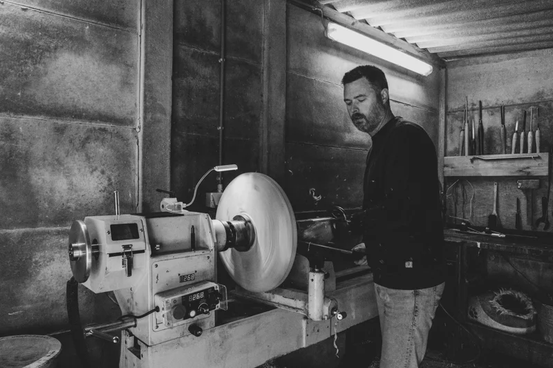Cracks, knots, and imperfections are incorporated into his work, serving as a reminder of the tree it came from.